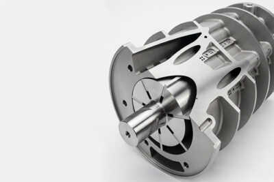 Принцип работы: два роторных вала (ведущий и ведомый) с зеркально-симметричным профилем вращаются в противоположные стороны в плотно пригнанном корпусе. Воздух захватывается во впускном отверстии, перемещается вдоль оси вращения в межвинтовых полостях и сжимается по мере уменьшения этих полостей к выпускному отверстию. Процесс непрерывный — без пульсаций и клапанов.