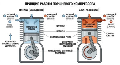 Принцип работы: поршень движется возвратно-поступательно в цилиндре. При движении вниз (такт всасывания) открывается впускной клапан, воздух заполняет цилиндр. При движении вверх (такт сжатия) впускной клапан закрывается, объём уменьшается, давление растёт. При достижении давления нагнетания открывается выпускной клапан, воздух поступает в ресивер.