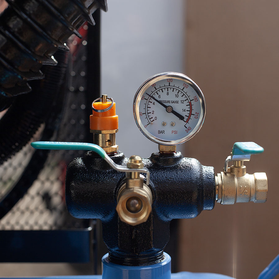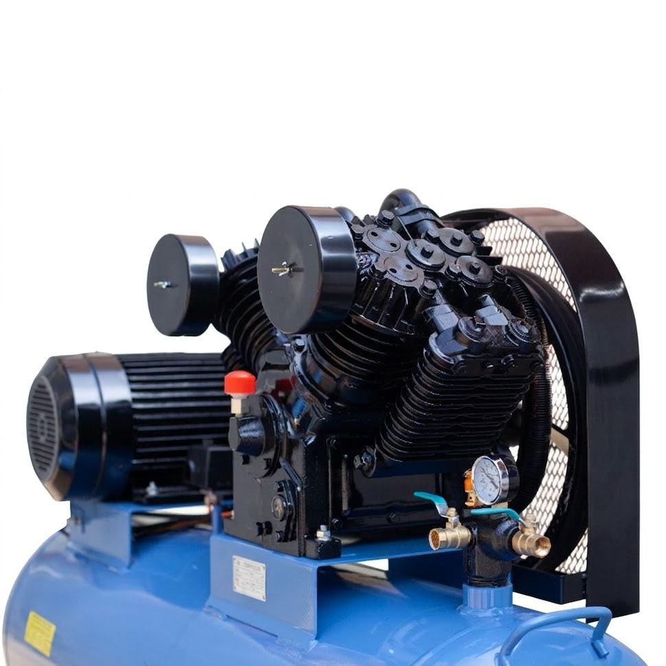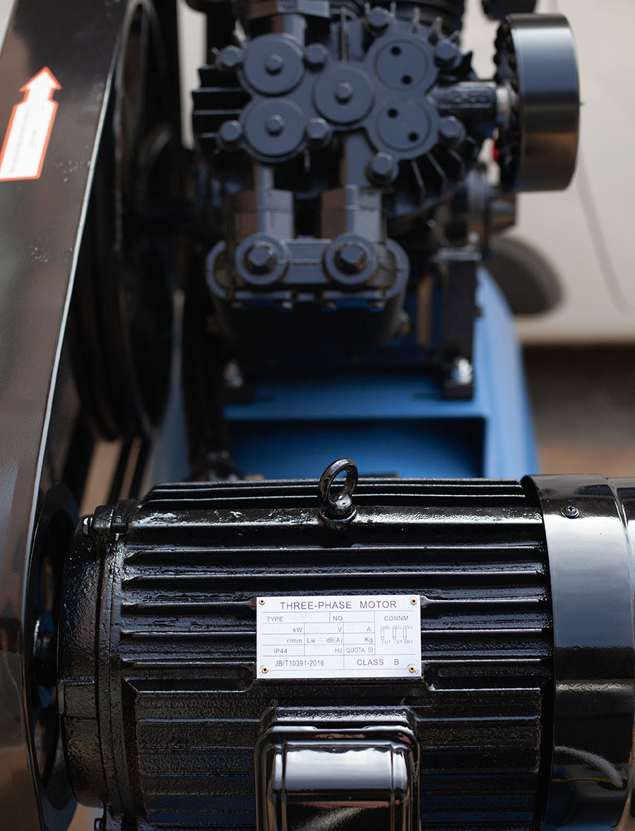 Повышенное давление 12,5 бар обеспечивает эффективную компенсацию потерь давления в длинных пневмолиниях и позволяет работать с оборудованием, требующим более высокого входного давления: промышленные пескоструйные аппараты, пневмопрессы, шины грузовиков и спецтехники. Это достигается за счёт двухступенчатого сжатия в 4-цилиндровом V-образном блоке.