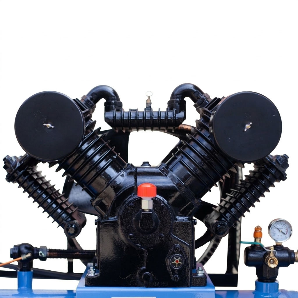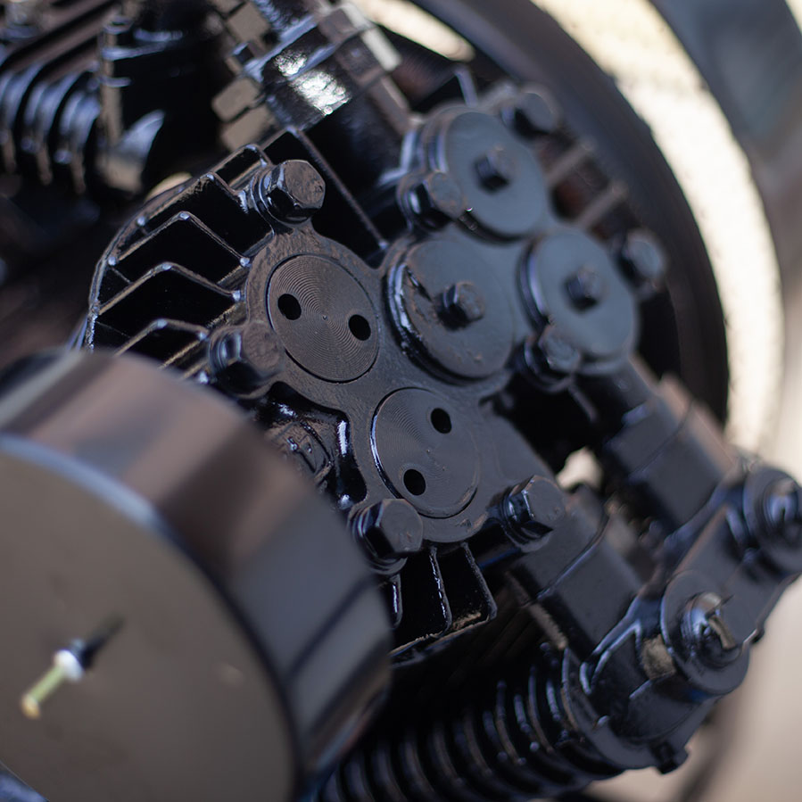 V-образная компоновка 4 цилиндров обеспечивает оптимальный баланс и позволяет достичь производительности 1050 л/мин при мощности 7,5 кВт. Такая конфигурация обеспечивает равномерную нагрузку на коленчатый вал, снижает вибрацию и обеспечивает быстрый набор давления даже при подключении нескольких потребителей.