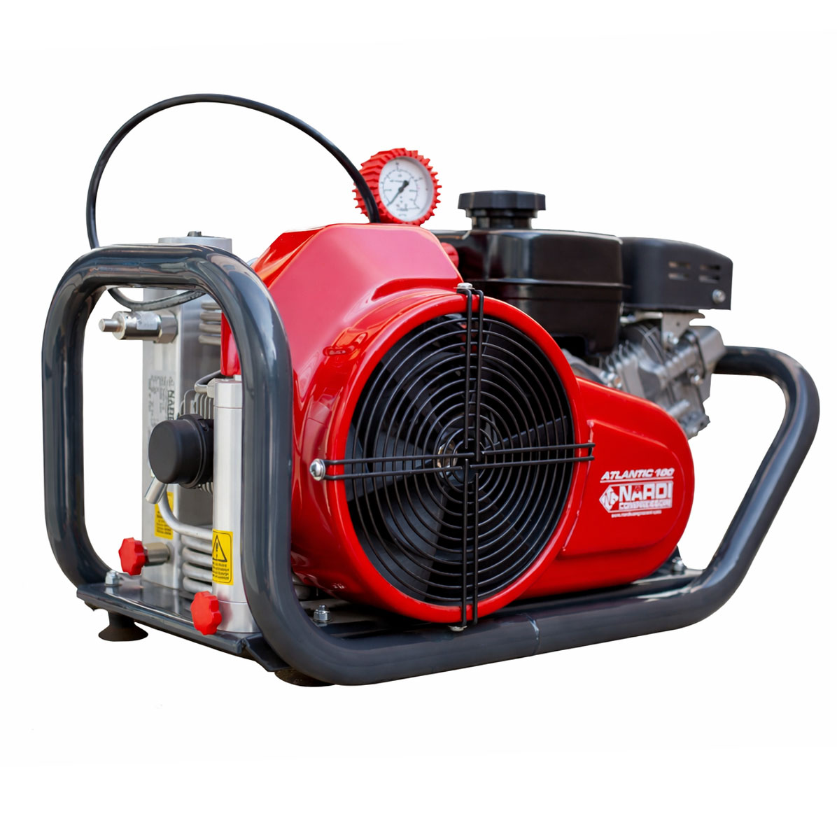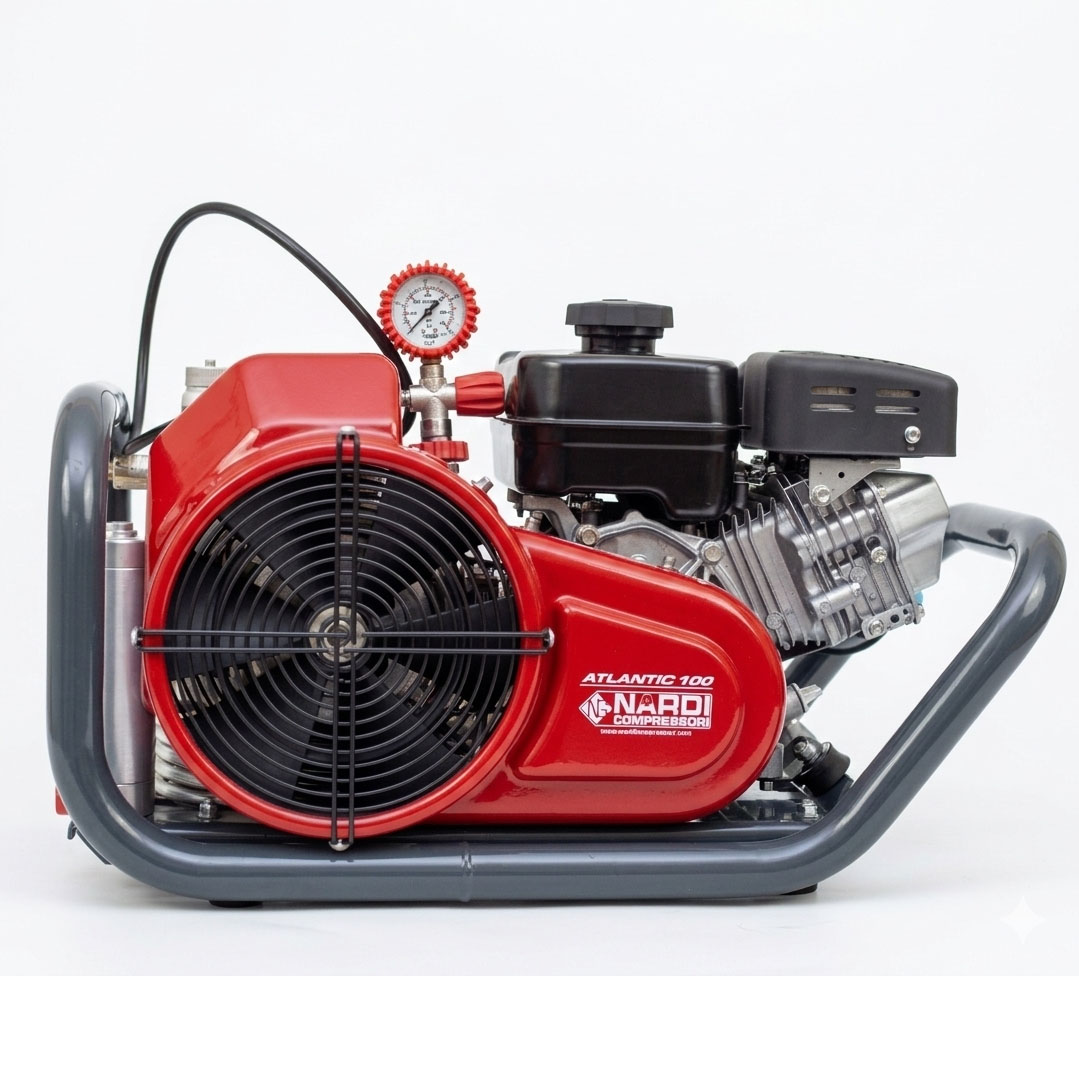 Atlantic G100 — это высокопроизводительный портативный компрессор для дыхательного воздуха от итальянской компании Nardi Compressori. Данная модификация оснащается бензиновым двигателем Robin (Subaru) мощностью 6,0 л.с. (4,2 кВт), что делает его полностью автономным и подходящим для использования в полевых условиях, например, для дайвинга, пожарных служб или пейнтбола.