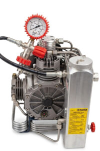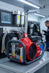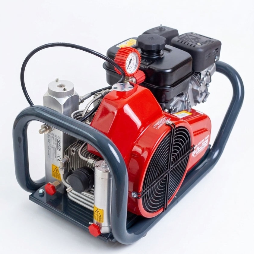 Перед вами компактный, высокотехнологичный портативный компрессор высокого давления. Такие устройства широко используются дайверами для заправки аквалангов, пожарными для дыхательных аппаратов, а также в промышленности и пейнтболе. Яркие красные элементы (чехол манометра, вентили) — это не только эстетика, но и функциональность: они хорошо заметны в условиях плохой видимости, что важно для безопасности.