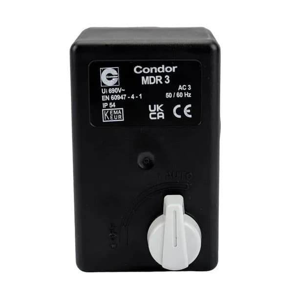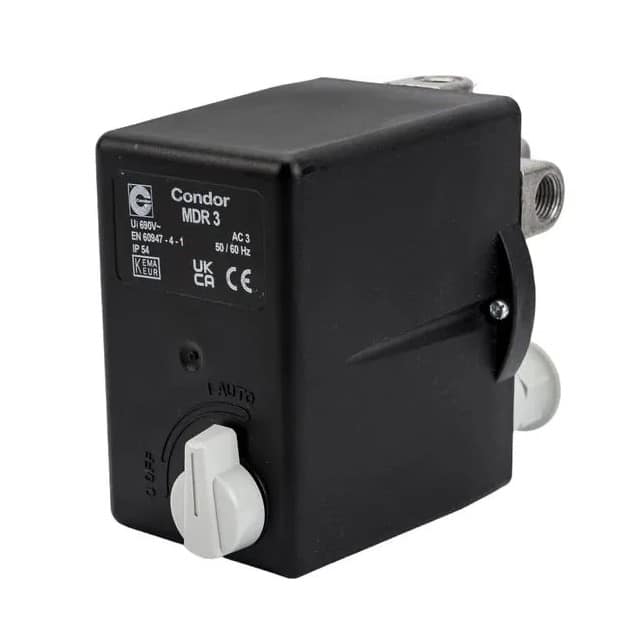 Condor MDR3 16/24A — это промышленное трёхфазное реле давления (прессостат) серии MDR 3 от Condor Pressure Control GmbH, предназначенное для автоматизации управления компрессорами и насосами по давлению. Устройство автоматически включает и отключает электродвигатель по заданным значениям давления и дополнительно интегрирует тепловую защиту двигателя с диапазоном 16–24 A, что обеспечивает надёжную эксплуатацию в тяжёлых условиях.
