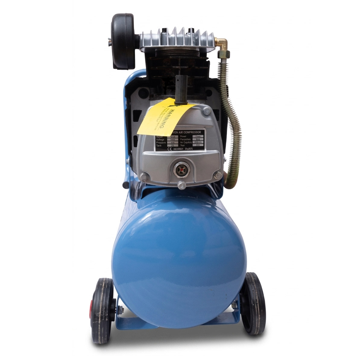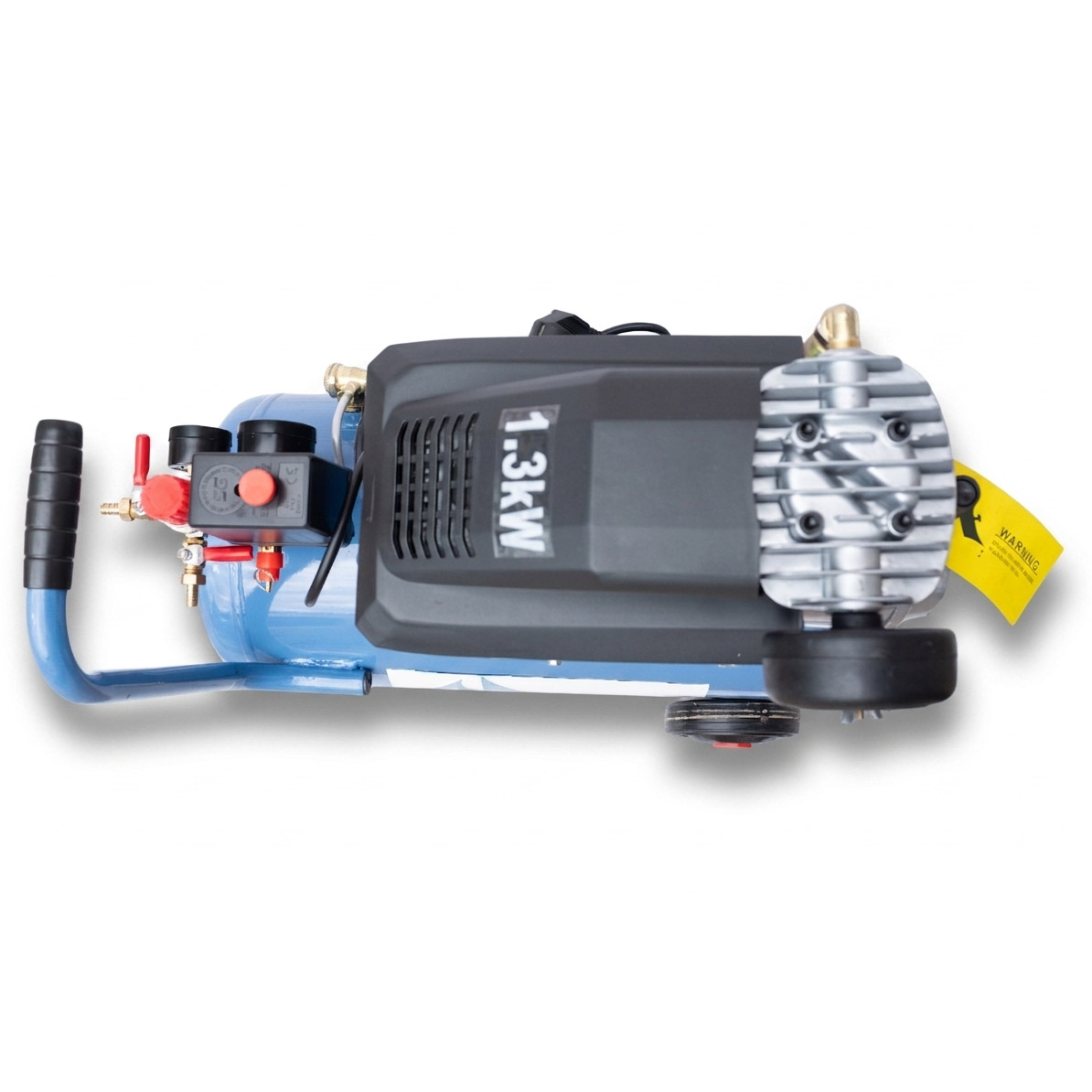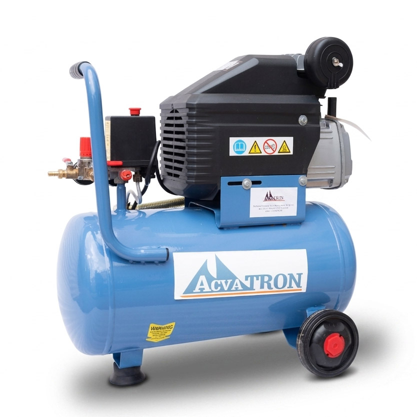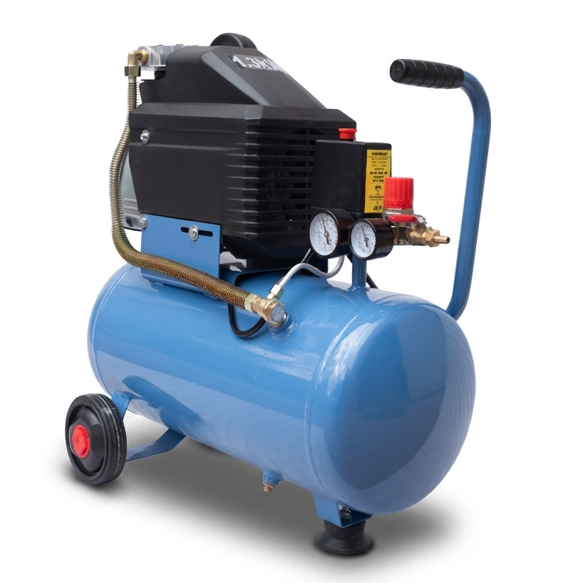 Компрессор работает от обычной розетки 220 В, оснащён ресивером объёмом 24 литра, обеспечивает рабочее давление 8 бар и производительность 100 л/мин.
