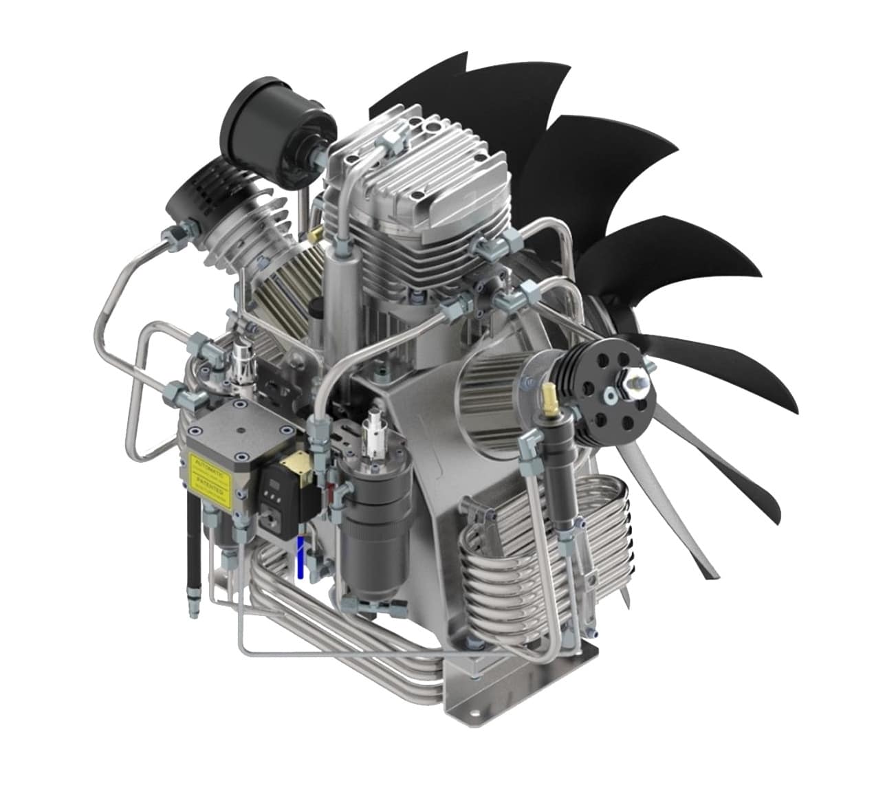 В установке применяются лопасти вентилятора специальной аэродинамической формы в виде крыла. Это обеспечивает мощный поток воздуха при низких оборотах, что в сочетании с межступенчатыми змеевиками из нержавеющей стали исключает перегрев даже при непрерывной многочасовой работе.