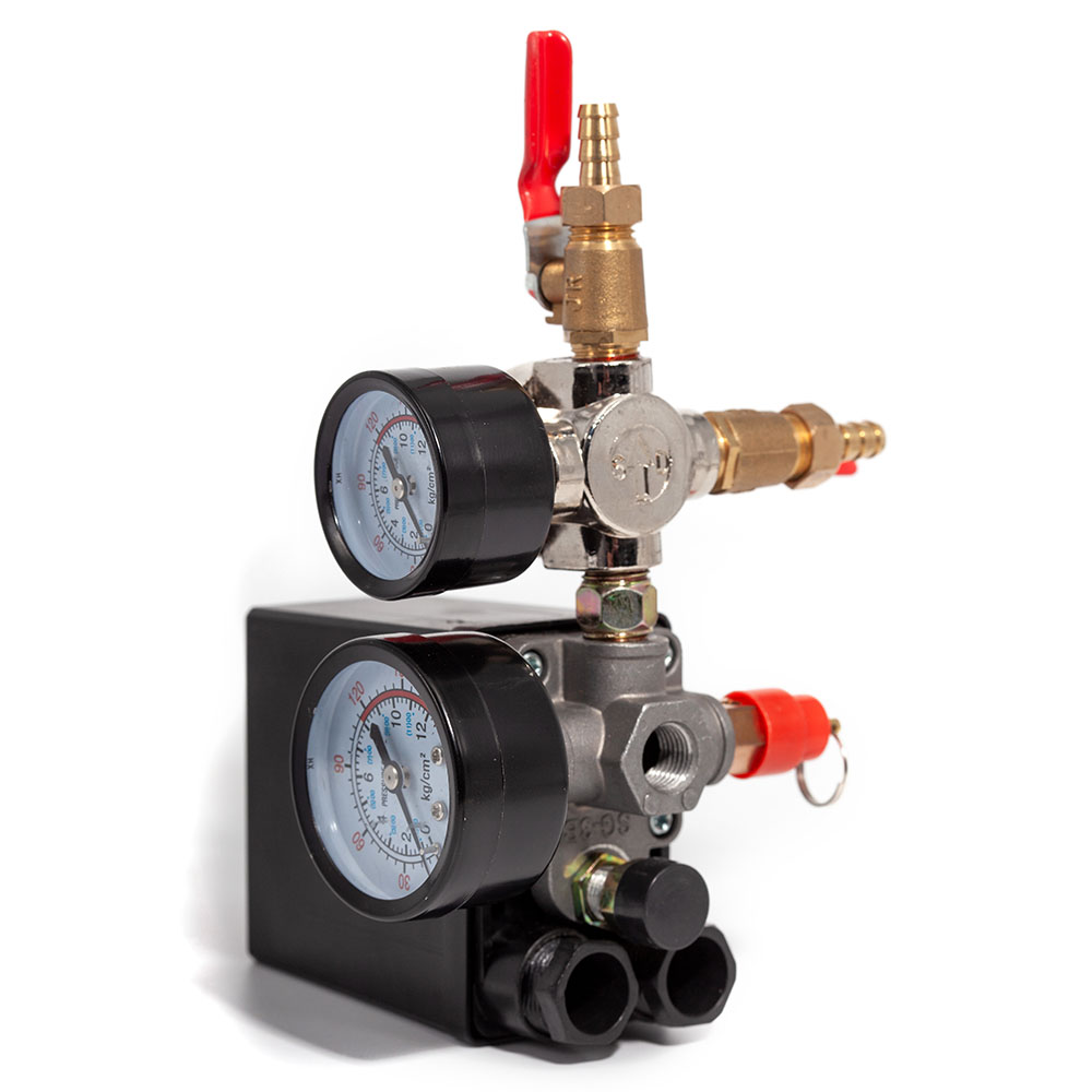 Реле давления 200V — 1/4″ F x 4 с редуктором, с манометрами, предохранительным клапаном и 2 краниками — это электромеханический прессостат для поршневого компрессора, предназначенный для автоматического управления электродвигателем по давлению в ресивере. Устройство включает мотор при падении давления ниже нижнего порога и отключает его при достижении верхнего порога, обеспечивая стабильную работу всей пневматической системы без постоянного участия оператора.