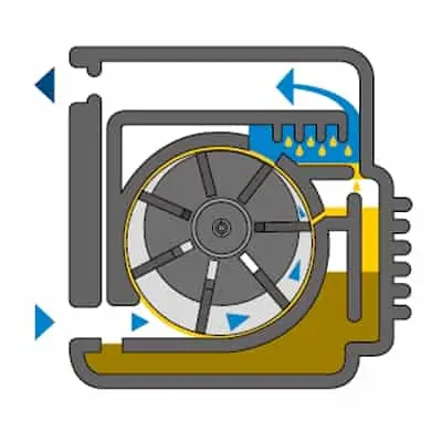 Ротор оснащён канавками, в которых лопасти могут свободно перемещаться. Центробежная сила постоянно прижимает их к стенкам статора, обеспечивая идеальную герметизацию благодаря непрерывной масляной плёнке. Такой постоянный контакт исключает утечки и обеспечивает высокий объемный коэффициент подачи.