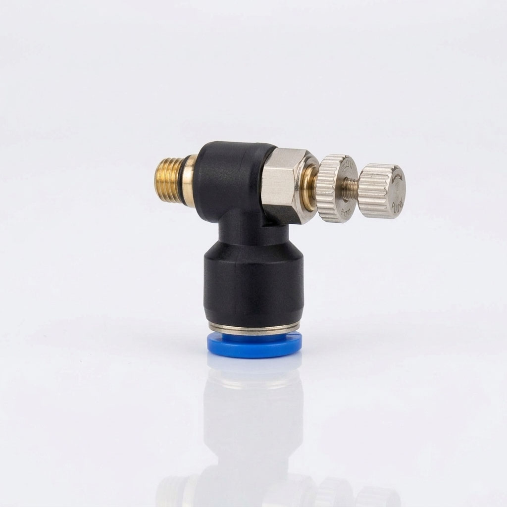 - Принцип: Фитинг ограничивает (дросселирует) поток воздуха, который выходит из полости цилиндра, при этом пропуская входящий поток свободно через встроенный обратный клапан.