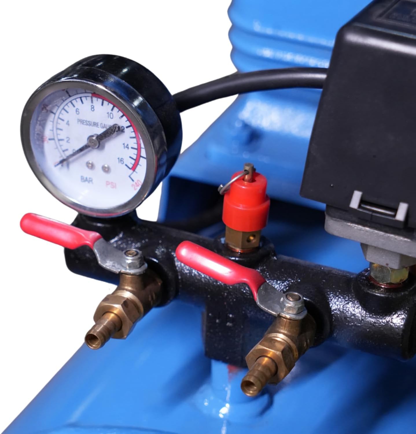 Прессостат (блок управления) четко контролирует циклы включения и выключения, защищая мотор от перегрузок
