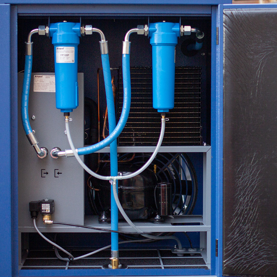 • Интегрированная система подготовки воздуха — встроенный осушитель холодильного типа с точкой росы +3 °C и двухступенчатая фильтрация (HP500 FF + MF). Опциональный фильтр HP500 SMF поднимает класс чистоты до 1.4.1 по ISO 8573-1, полностью исключая влагу, масло и частицы, что критично для защиты оптики лазерных головок.